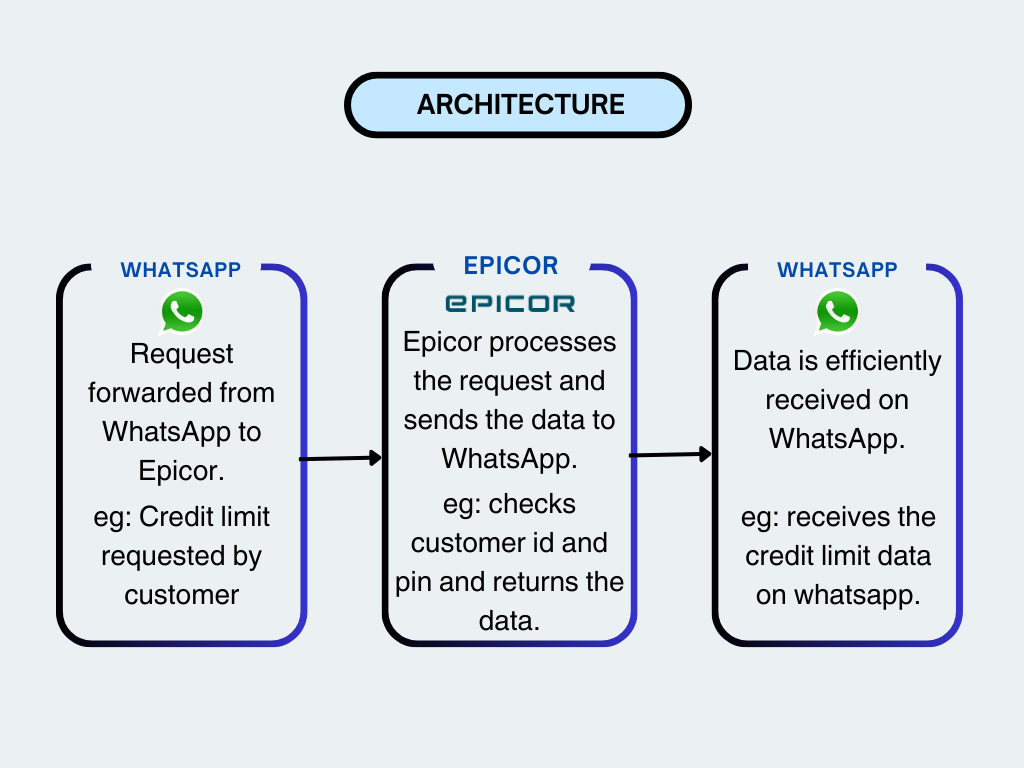 Our latest innovation, specializes in seamlessly integrating WhatsApp with enterprise software, including Epicor. This involves establishing a robust connection between the two systems, facilitating efficient data exchange and communication. Leveraging WhatsApp’s messaging capabilities within the Epicor ERP system, it introduces diverse use cases, enhancing collaboration, and streamlining communication for optimized business processes.
